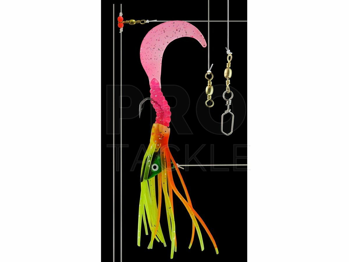 Spoon-Leader Floating Jig Head Catchy bycatch-leader with one side-arm. Glittery leader with UV-luminous UV-Octopus, fringe, and a free-swimming fish-tail. Assembled on a Floating Jig-Head with strong hooks, sturdy swivel, and high-quality leadermaterial. Ideal for catching Cod, Pollack, Coalfish, etc. Hook size: 5/0, Line 0,60 mm, Length 115 cm. 1 ea./SB-packaged.