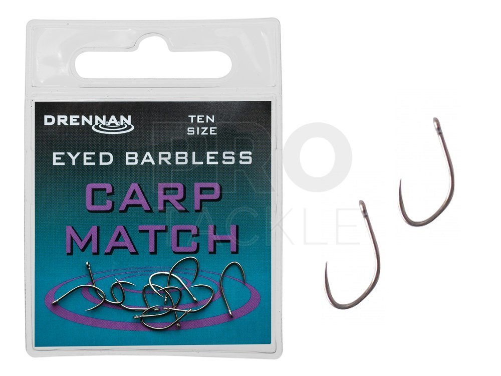 Barbless hooks. Drennan Eyed Barbless Carp Match Hooks are produced in medium gauge super high carbon steel Carp Match hooks have a special bend and extra long curved point to improve both hooking and holding. Key features: • Ground and chemically etched point • Super high carbon steel wire • Extra long curved point • Barbless • Eyed Ideal for waggler or pole fishing and for a wide variety of baits from maggot to corn, meat and pellet. They are also perfect for tying up neat match style hair rigs using a knotless-knot.