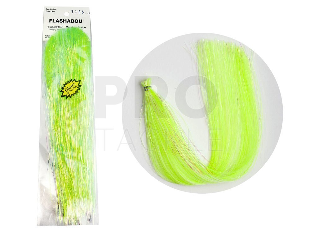 Winging Material for Jigs and Streamers. Tinsel Flash. Marabou Action. A glow in the dark and pearl Flashabou blend for an extremely effective fly or lure pattern. The glow strands catch the attention of fish from a greater distance as the flash and movement of the pearl strands mimic an escaping bait fish. Specially treated strands bring their own light to low or no-light applications.
