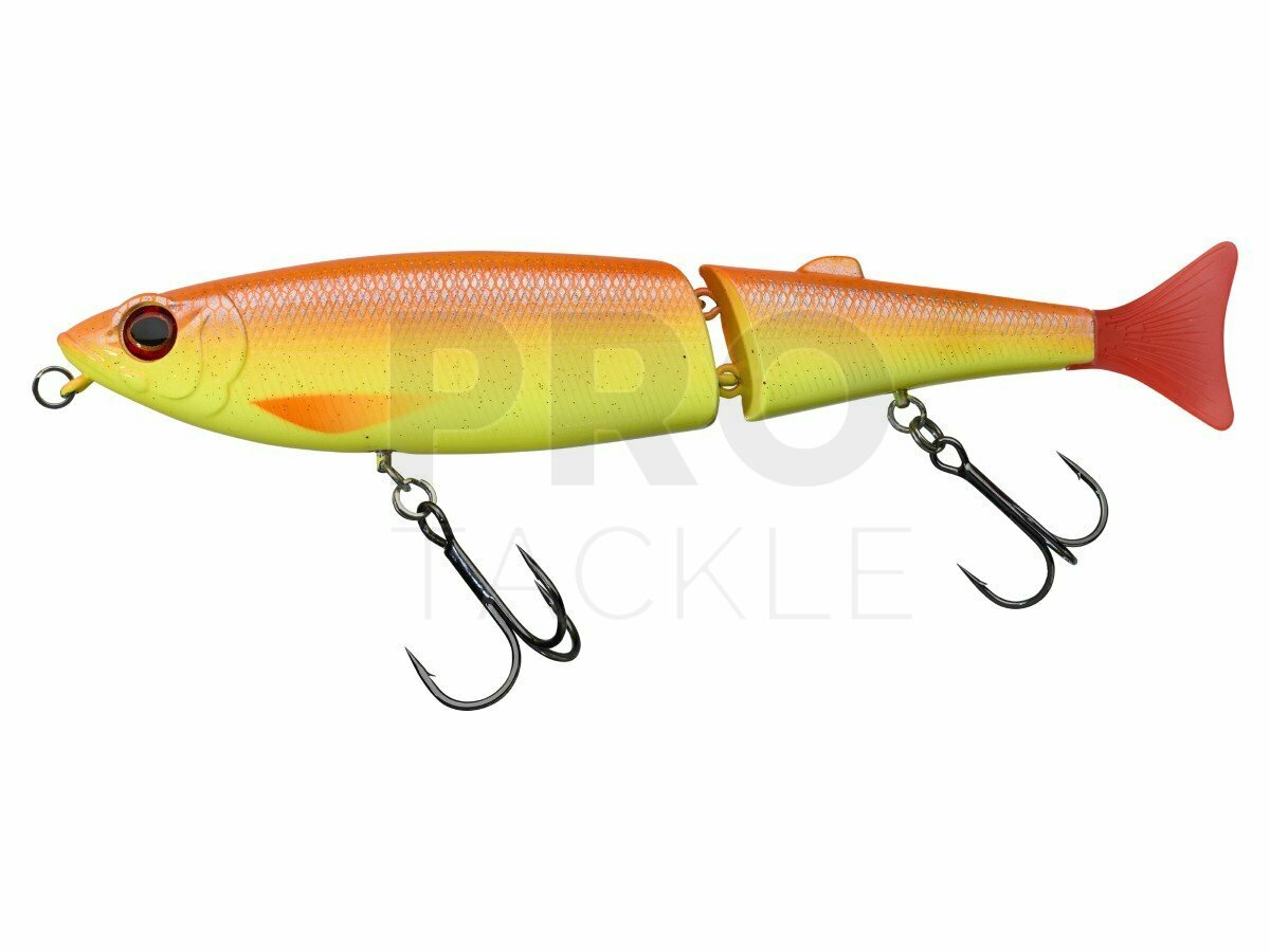 A “noisy” version of our great 2-section FREDDY 130 CATWALK glidebait. The perfect lure for targeting large European pike, perch and black bass. Designed especially for smaller waters or conditions such as low light levels or coloured water. This small lure is ideally suited to any medium-heavy spinning or bait casting rod. Sinuous “S” shaped swimming action on straight retrieves can be amplified by twitching to the left or right or made more seductive by the occasional stop and go movement. Two integrated rolling 30lb swivels rotate a full 360 degrees helping reduce snagging up and keep your hooks in place during acrobatic fights. Has the density to cast a long way accurately and is ideal to fishing round weed beds, structures and tree-lined banks. To make the lure even more versatile try adding a JOHN WEIGHT on the stomach swivel to explore deeper water layers. This swimbait is as technically advanced as it is easy to fish with! Available in 5 new realistic colours.