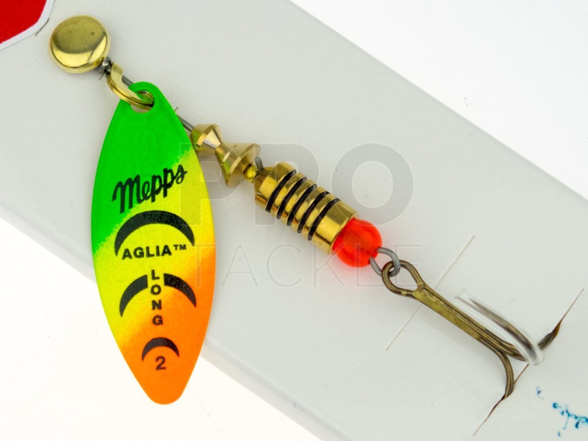 Aglia Long is a deep running willow leaf spinner. Its blade hugs the body of the spinner during retrieve, allowing it to stay in deep pockets long enough to attract the wariest fish. Like most Mepps spinners, the Aglia Long is available in both treble and single hooks. Plain and dressed. Lure size is important. The rule of thumb is use smaller lures to catch smaller fish and larger lures to catch larger fish. Keep in mind plain spinners present a smaller profile than dressed spinners, so they will appear smaller to the fish. This makes Spinners Mepps Aglia Long perfect for panfish and small stream trout. Fishing with dressed spinners can produce larger fish, but, when stream trout fishing, you will probably catch more fish using plain spinners.