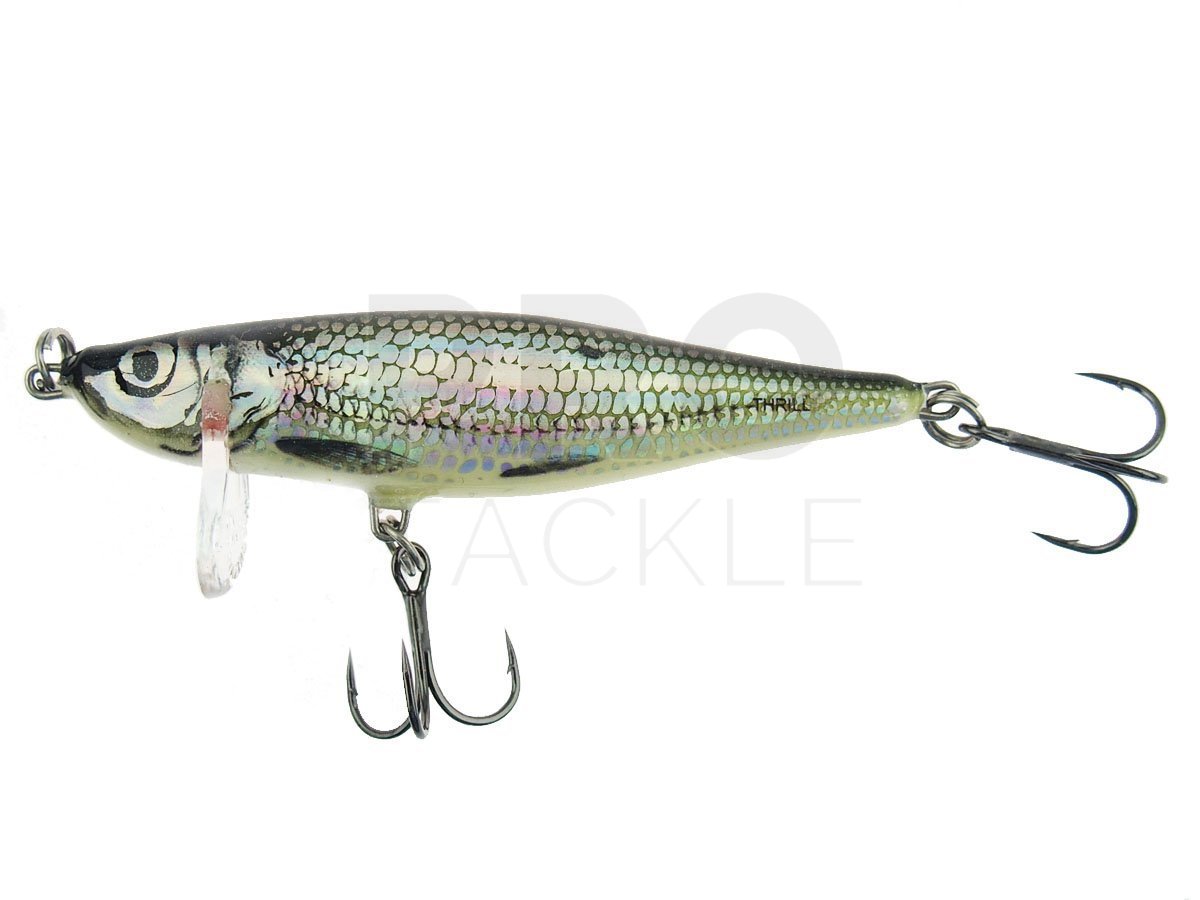 Asp, that exclusive salmon of fresh waters. Fast and beautiful like silver lightning. The apear like ghosts causing sprays of water and angler`s heart attacks. It is always hard to admit thet there are fish that are impossible to catch, especially the big ones. The new Salmo Thrill is the new answer to that problem. It casts a like a bullet so you`ll easily reach places where asp feed even as far as 70 metres away, but only if you cast there... "How to fish with Thrill" Thrill is a special lure for asp fishing. Despite of its heavy weight to size ratio, and despite of the fact that it`s a sinking lure, your Thrill should be retrieved just under the surface. After making a long cast we start to retrieve the line immediately while keeping rod tip high. The speed of line recovery needs to be very high. This is where you`ll find high geared reels come in handy (gear ratio at least 6:1). Lure type - Crank bait In the Salmo offer since - 2007 Available versions - Sinking Recommended method of fishing - casting / fast retrieves under surface Recommended for - asp