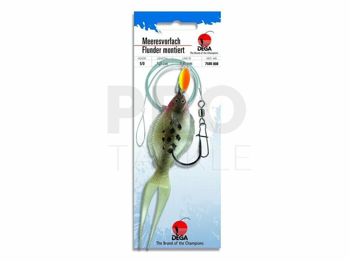 Flounder Sea-rig This DEGA Sea-rig features a plastic bait in the shape of a flounder. The luminous beads and very sharp hook, are fastened to a sturdy line. Ideal suited as a leader for sea-angling for cod and friends. Total length: 1,0 m