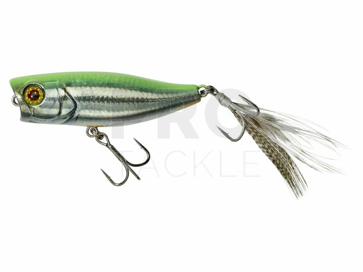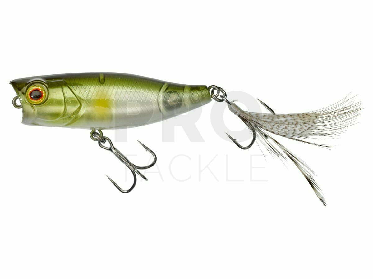 This small popper is an updated version of the CHUBBY. Simply fantastic when predators are chasing prey of the same size as the lure (larvae, amphibians or fry). Compact and well proportioned, the lure casts like a dream thanks to its internal weight. The Chubby popper has a walking the dog type action and will splash and pop with ease imitating frightened prey. Any popper worth its salt needs to sit well when stopped. To recreate the look of the tail of a prey fish or an insect's wings, the lure is fitted with a feather hook- sure to fool the wariest of chub or black bass