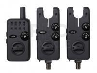 Sets of a receiver and alarms with adjustable volume, tone and sensitivity. To set the volume and sensitivity there are two, easy to reach king-sized dial knobs. On the left side of the housing there are two push buttons: one to set the tone (T) and one (L) to switch on/off the lighthouse LED on the back. After having rowed out the bait, that blinking LED enables you to easily find your way back to your swim. The 3-way switch at the bottom is easy to reach, easy to operate and, most of all, easy to read: to the left is “on”, in the middle is “off” and to the right is “mute”. Drop back indication by light and sound (white LED and a double tone). The reach of the transmitter is at least 100 meters. The receiver has sound, light and vibration bite indication. Alarms and receiver are rain proof. All in all, alarm sets that are easy to understand, easy to operate but still have all the modern features you need to fish as effectively and comfortably as possible. The alarms work on two 1.5V batteries (AAA) and the receiver too (not included). • Adjustable volume, tone and sensitivity • Dr...