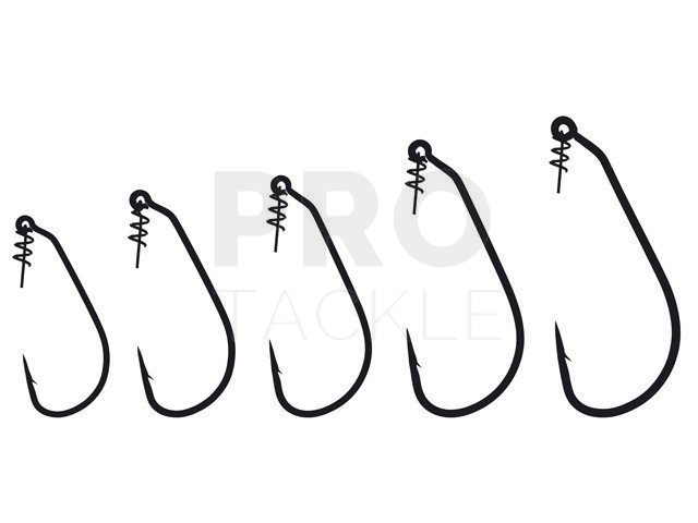 Special drop shot hooks with reversed eye. They have special screw to put soft lure on it. This bass hook is Unique with its TwistLOCK™ Centering-Pin Spring (Patented) attached to the hook eye. Baits can be permanently secured by inserting the pin in the center of the nose of a soft plastic, which can then be twisted (screwed) onto the TwistLOCK™ coil spring so that any bait will rig perfectly everytime! The hook'sopen gap allows for more positive and effective hook sets. Ideal for weedless-style Carolina Rig'n and Texas Rig'n of big tube baits and beefy soft plastics. Features include a 30°eye-bend, XXX-strong forged shank, Super Needle Point, and black chrome finish.